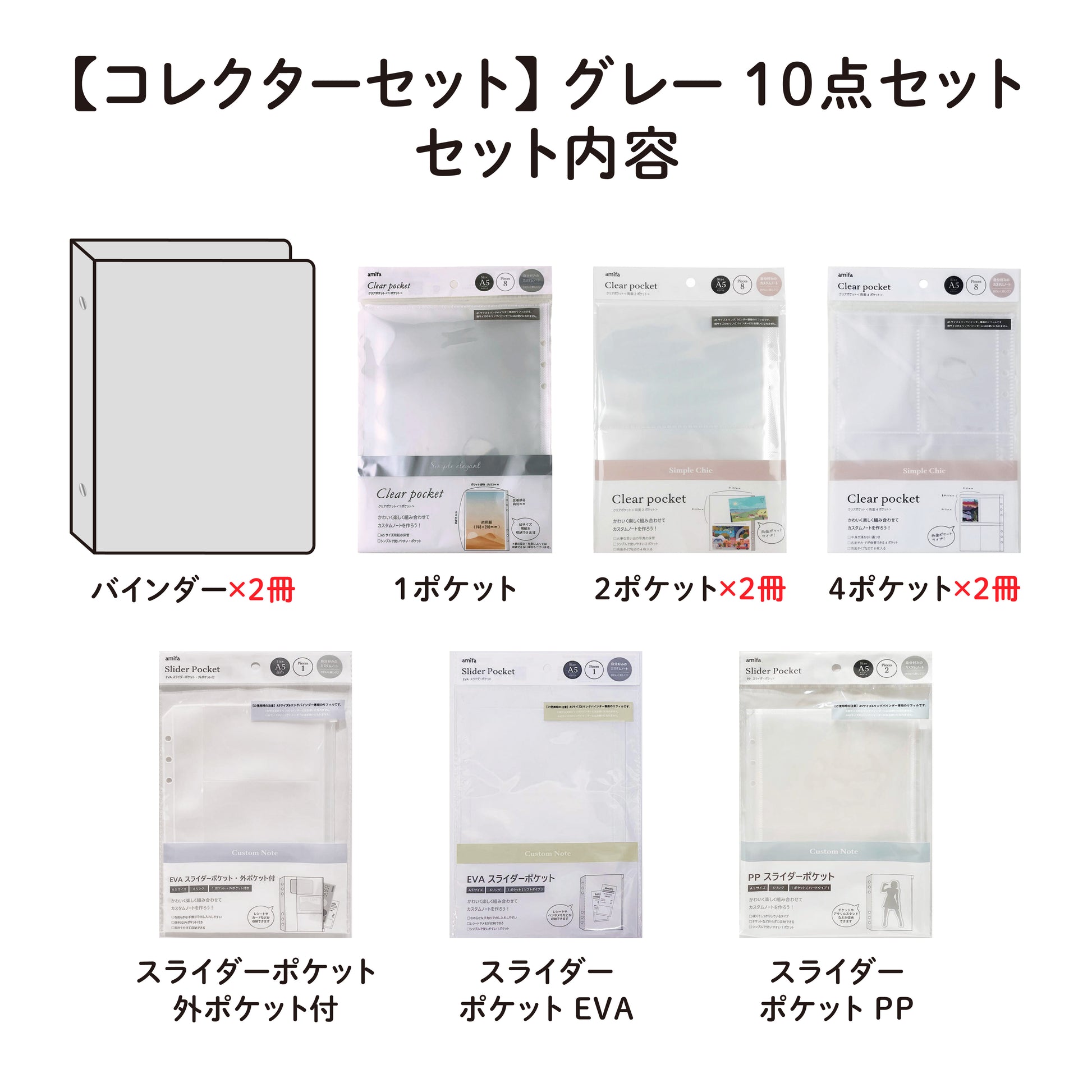 ・A5尺寸・6孔活页夹宽灰色2本・透明口袋1个口袋8页